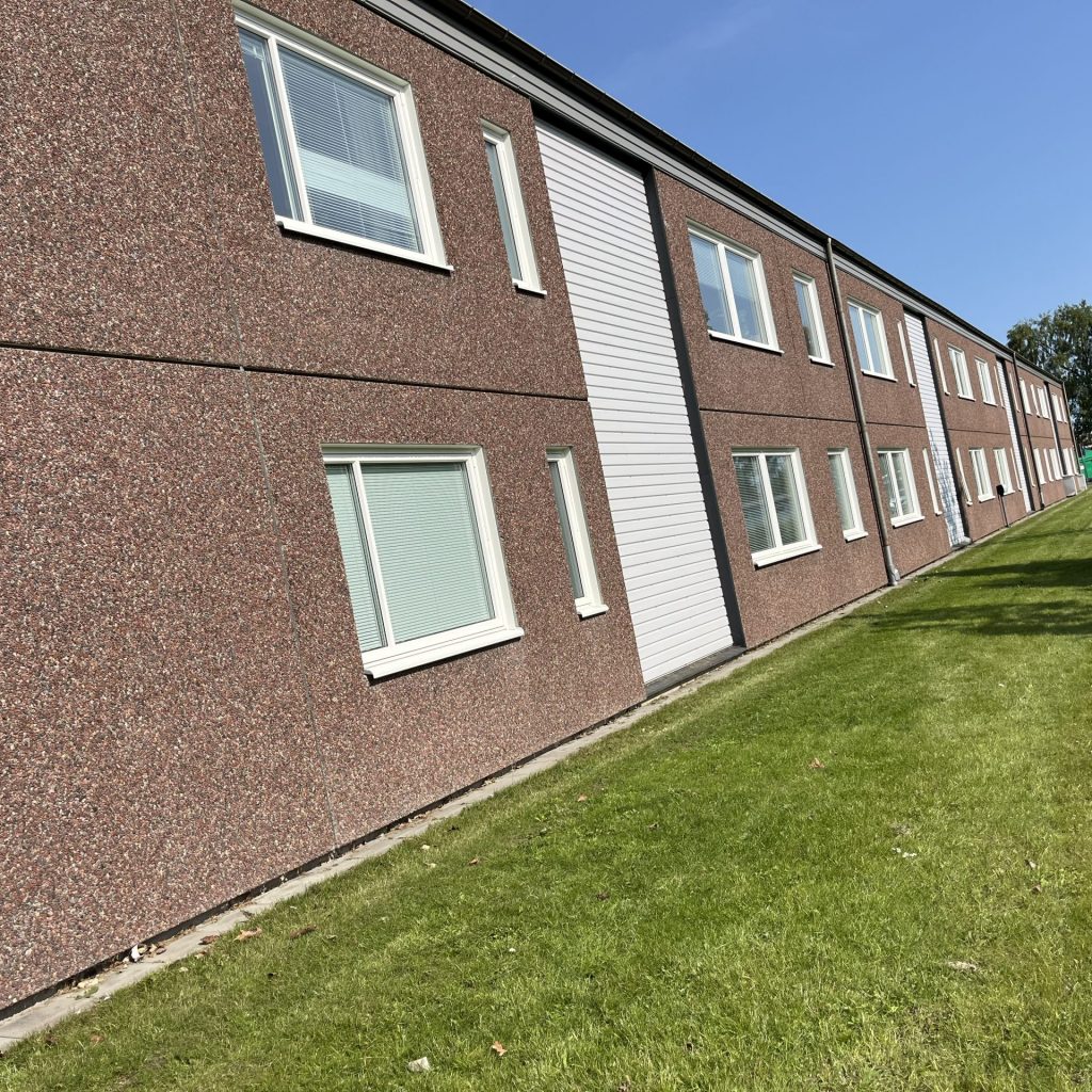 I Värnamo har vi avslutat en fönsterrenovering i en bostadsrättsförening där alla lägenheter fick nya fönster och fönsterdörrar. Balkongerna har renoverats, ventilationen i tvättstugorna har förbättrats och samtidigt har vi tagit hand om asbest och PCB på ett säkert sätt.